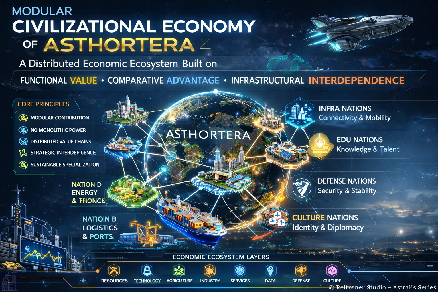 The Asthortera economic system operates as a modular civilizational architecture where each nation contributes specialized capabilities. Unlike monolithic legacy economies, Asthortera functions as a distributed economic ecosystem built on functional value, comparative advantage, and infrastructural interdependence.