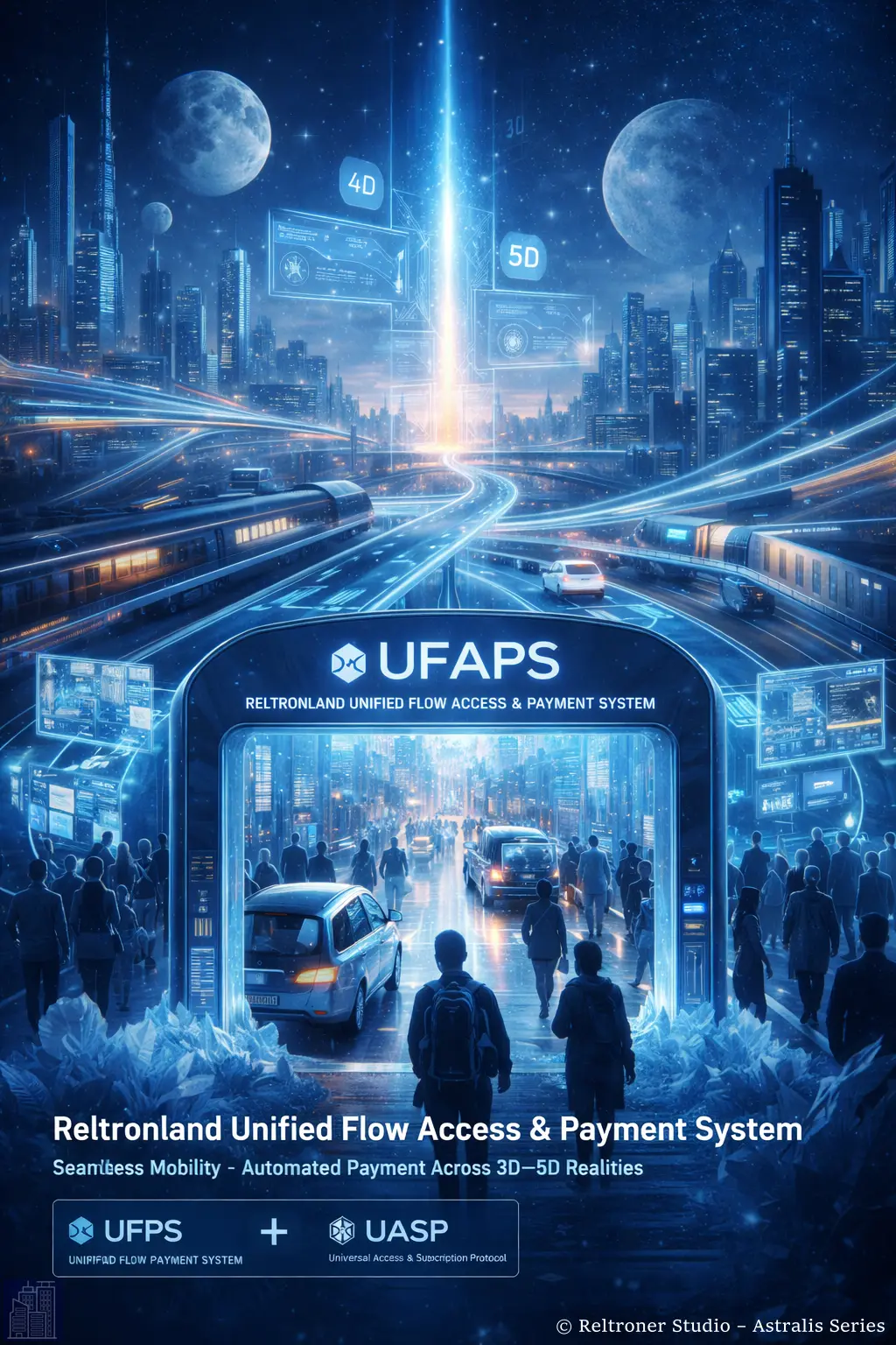 UFAPS is Reltronland’s integrated national infrastructure for frictionless mobility and automated payment, combining the Unified Flow Payment System (UFPS) and the Universal Access & Subscription Protocol (UASP) into a queueless, barrierless, and transparent mobility architecture across 3D–5D domains.